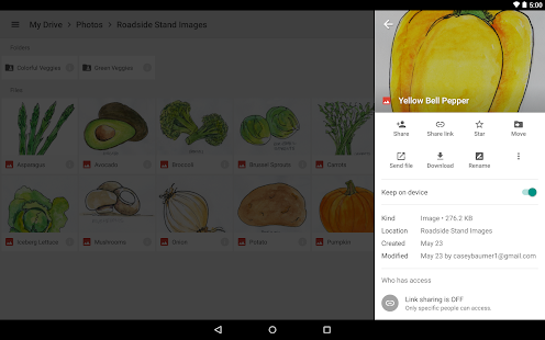 * Use the Google Drive Android app to access your photos, documents, videos and other files stored on your Google Drive